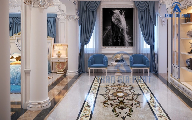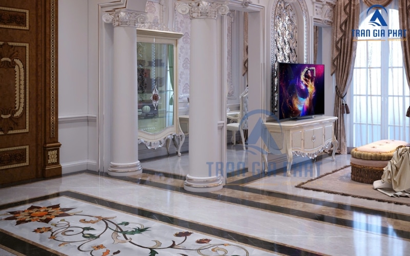 Tại các sảnh lớn của biệt thự, khách sạn, trung tâm hội nghị, hoa văn đá thường được kết hợp hài hòa với đá lát sàn xung quanh để tạo thành một bố cục hoa văn trung tâm nổi bật. Kiểu trang trí này đặc biệt phù hợp cho những công trình theo đuổi phong cách châu Âu cổ điển hoặc hoàng gia, bởi nó làm toát lên vẻ tráng lệ và quý phái ngay từ khu vực sảnh đón. Đối với nhà phố hoặc căn hộ hiện đại có sảnh nhỏ, cũng có những mẫu hoa văn đá cỡ nhỏ tinh tế giúp tạo điểm nhấn vừa phải, khiến không gian bớt đơn điệu mà không sợ quá tải chi tiết.