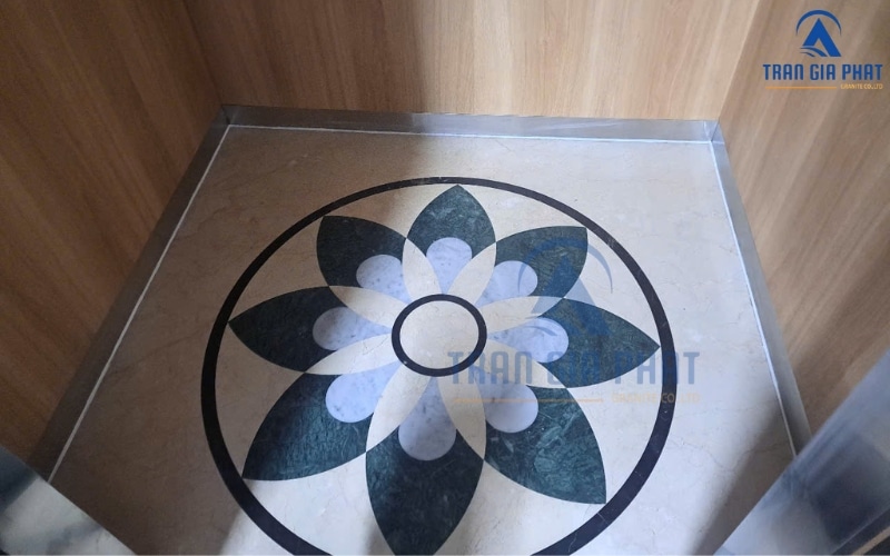 Thông thường, do diện tích nhỏ nên chi phí lát đá hoa văn cho cabin thang máy không quá cao, nhưng hiệu quả trang trí thì rất đáng kể. Người ta thường chọn những mẫu hoa văn đơn giản mà tinh tế, kích thước vừa vặn với sàn cabin. Phổ biến nhất là các mẫu hoa văn tròn hoặc vuông đường kính khoảng 60–80 cm đặt chính giữa sàn thang. Họa tiết có thể đồng bộ với phong cách nội thất của mỗi tầng nhà, tạo sự liền mạch khi mở cửa thang máy.