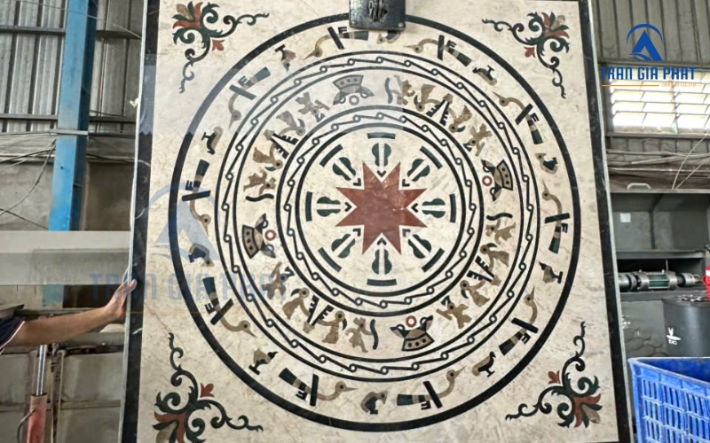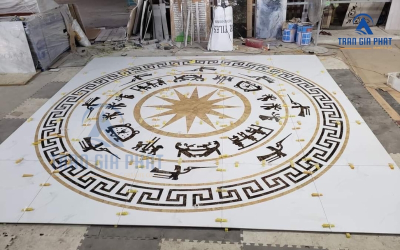 Chọn kích thước vừa phải: Không nên chọn hoa văn quá lớn nếu không thực sự cần thiết. Hoa văn càng to thì giá càng cao, việc thi công cũng khó hơn. Nên chọn kích thước cân đối với không gian. Ví dụ sảnh rộng khoảng 20 mét vuông thì hoa văn đường kính 1.2 mét là hợp lý, vừa đẹp vừa không gây lãng phí.