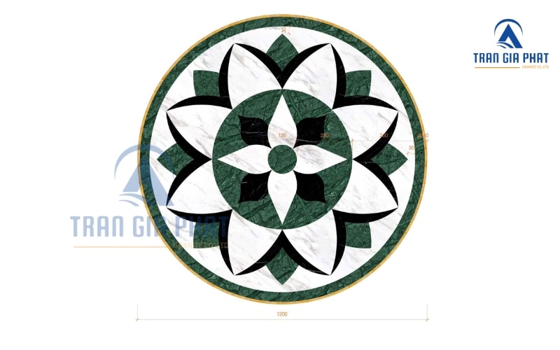 Về kích thước, khung viền thường rộng từ 5 đến 15cm tùy vào diện tích và độ lớn của hoa văn. Hình dáng viền cũng nên theo kiểu dáng hoa văn: hoa văn tròn thì viền tròn, hoa văn vuông thì viền vuông để tạo bố cục cân đối. Viền cắt cần sắc nét, ghép khít để đảm bảo tính thẩm mỹ. Màu viền lý tưởng cho hoa văn đá marble xanh thường là trắng, kem, đen hoặc xanh đồng tông. Mục đích là tôn lên vẻ đẹp của đá xanh, tạo điểm nhấn hài hòa với tổng thể nội thất.