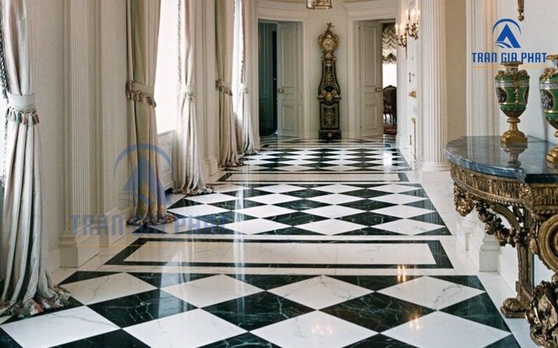 Với màu sắc nổi bật, đá marble xanh thường được chọn để làm hoa văn lát nền tại các khu vực sảnh chính, sảnh thang máy hoặc làm điểm nhấn giữa sàn nhà. Những tấm đá xanh được cắt CNC thành các họa tiết như hình tròn, hình vuông, hoa lá rồi ghép lại thành một thảm đá giữa sảnh sẽ khiến không gian trở nên ấn tượng và sang trọng.