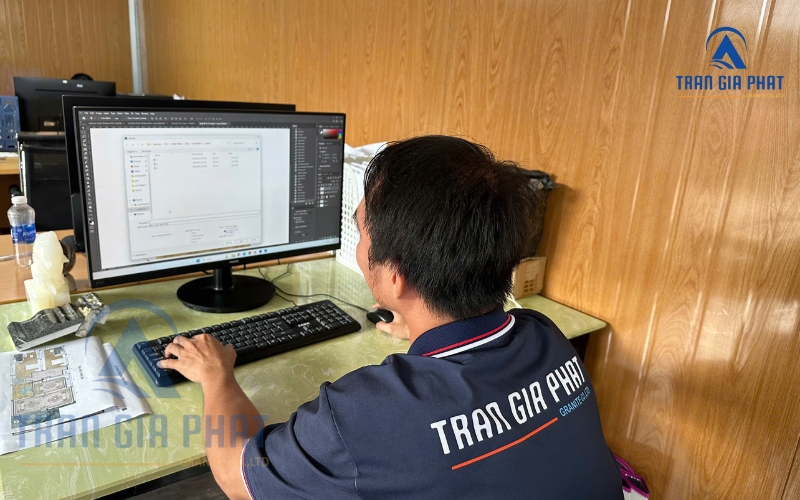 Chúng tôi sở hữu xưởng sản xuất, đội ngũ thợ lành nghề và quy trình thi công khép kín. Từ tư vấn, thiết kế 3D, cắt CNC chính xác đến lắp đặt đúng tiến độ. Trần Gia Phát đặc biệt chú trọng phong cách cá nhân hóa, thiết kế hoa văn đá theo mệnh. Đặc biệt, theo bản vẽ kiến trúc để đảm bảo tính thẩm mỹ, phong thủy và độ bền vượt trội.
