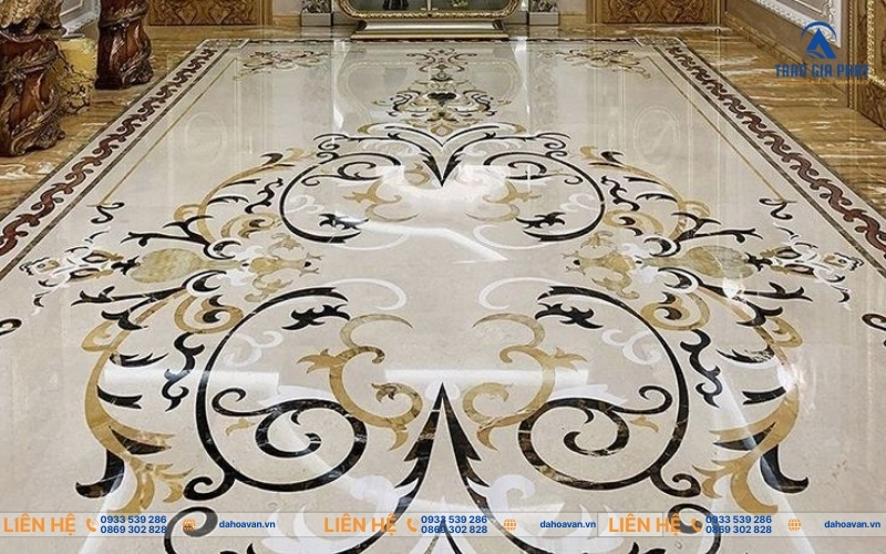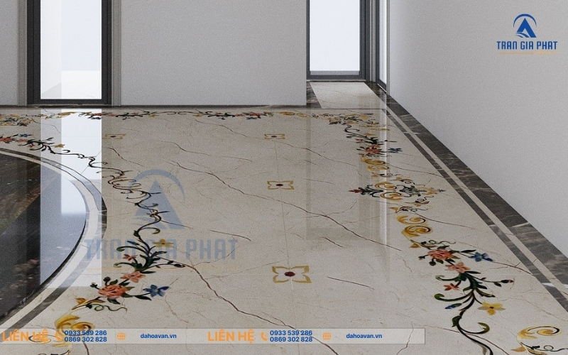 Sảnh chính và tiền sảnh của biệt thự, nhà phố thường được lát hoa văn đá để chào đón khách ngay từ cửa vào. Hoa văn ở khu vực này thường là những mẫu lớn, có họa tiết cầu kỳ, lộng lẫy để tăng cảm giác hoành tráng. Việc sử dụng hoa văn đá giúp khu vực đón khách trở nên nổi bật và sang trọng nhờ ánh sáng phản chiếu lung linh trên bề mặt bóng mịn của đá. Các showroom, đại sảnh khách sạn cũng thường dùng cho sàn chính, bởi sự bền màu và dễ vệ sinh giúp tiết kiệm chi phí vận hành lâu dài. Nhìn chung, ở bất kỳ khu vực đón tiếp nào, hoa văn đá đều giúp nâng cao gu thẩm mỹ, thể hiện đẳng cấp chủ nhân.