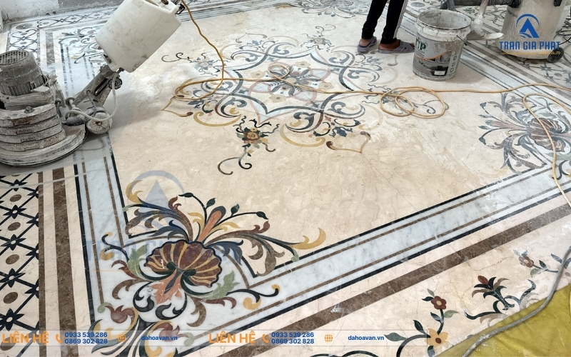 4. Ghép nối và mài bóng: Các mảnh đá sau khi cắt sẽ được ghép theo thiết kế với keo chuyên dụng. Sau đó, đội ngũ thợ tiến hành mài bóng kỹ lưỡng, đảm bảo mặt hoa văn đồng đều, sáng mịn. Từng tấm hoa văn sau mài được kiểm tra nghiêm ngặt để phát hiện kịp thời lỗi, sau đó mới đóng gói chuyển ra công trình.