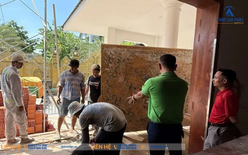 5. Kiểm tra chất lượng và giao hàng: Trước khi rời xưởng, mỗi tấm hoa văn được nghiệm thu về màu sắc, kích thước, độ bóng. Sau khi đạt chuẩn, sản phẩm sẽ được đóng gói cẩn thận. Trần Gia Phát áp dụng quy trình này với đội ngũ thợ lành nghề và máy móc hiện đại để đảm bảo tiến độ thi công nhanh, sản phẩm luôn đúng yêu cầu. Nhờ vậy, khi đến công trình, thợ chỉ cần cố định sẵn các tấm đá, không cần gia công thêm tại hiện trường, giúp tiết kiệm tối đa thời gian lắp đặt.