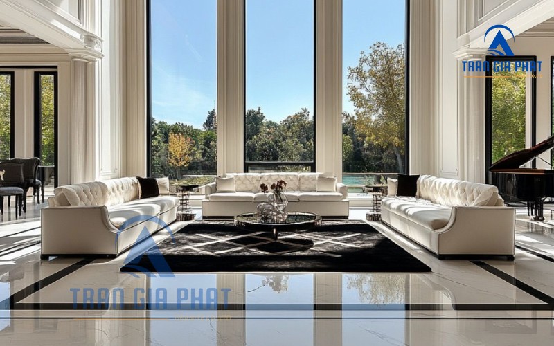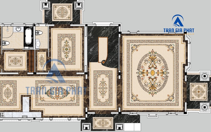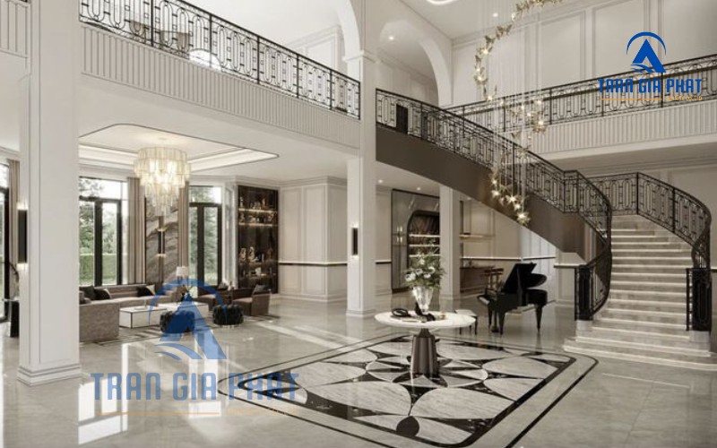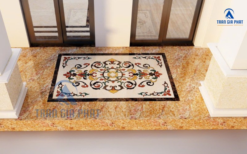 - Biệt thự & nhà phố cao cấp: Các biệt thự, nhà phố sang trọng thường sử dụng hoa văn đá tại sảnh chính, phòng khách hoặc chiếu nghỉ cầu thang. Chẳng hạn, một tấm thảm đá hoa văn đặt ở trung tâm phòng khách biệt thự sẽ tạo điểm nhấn độc đáo cho khu vực sàn, làm nổi bật sự đẳng cấp của không gian. Tại sảnh vào, hoa văn đá tròn hoặc vuông đặt chính giữa nền gạch cũng là lựa chọn phổ biến để gây ấn tượng đầu tiên với khách.