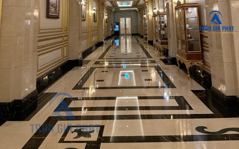 - Trung tâm thương mại & công trình công cộng: Ở các trung tâm thương mại cao cấp, hoa văn đá thường dùng để trang trí sàn khu vực sảnh chính, quảng trường trong nhà hoặc lối đi giữa các gian hàng lớn. Hoa văn được thiết kế tương phản màu sắc mạnh giúp thu hút sự chú ý của khách hàng và dẫn hướng giao thông nội bộ. Ngoài ra, các công trình công cộng sang trọng như sảnh tòa nhà văn phòng, phòng hội nghị, nhà hàng cao cấp cũng sử dụng hoa văn đá để tăng tính thẩm mỹ và tạo dấu ấn riêng. Việc lát hoa văn đá tại những nơi này đang dần trở thành xu hướng thiết kế, bởi nó mang lại không gian vừa hiện đại, vừa giữ được nét trang trọng cần có.
